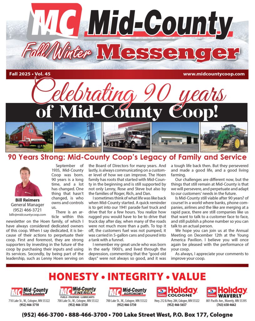 Inside volume 45 of the Mid-County Messenger you will learn more about Mid-County’s different departments including Agronomy, Energy, and more! There’s updates and information available for each department in the co-op containing information and updates on the successes and experiences or the last half year. READ NOW